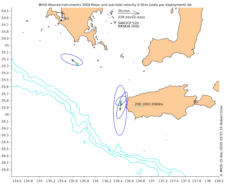 These maps show some basic analyses of the velocity data: mean (all-time in black and seasonal in colour) and sub-tidal variance for several layers and time-windows, and tidal harmonics for the depth-average velocity using the whole record. Click through to see more detailed plots of the selected dataset or to download those data from the AODN thredds server.
