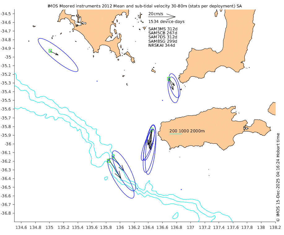 These maps show some basic analyses of the velocity data: mean (all-time in black and seasonal in colour) and sub-tidal variance for several layers and time-windows, and tidal harmonics for the depth-average velocity using the whole record. Click through to see more detailed plots of the selected dataset or to download those data from the AODN thredds server.
