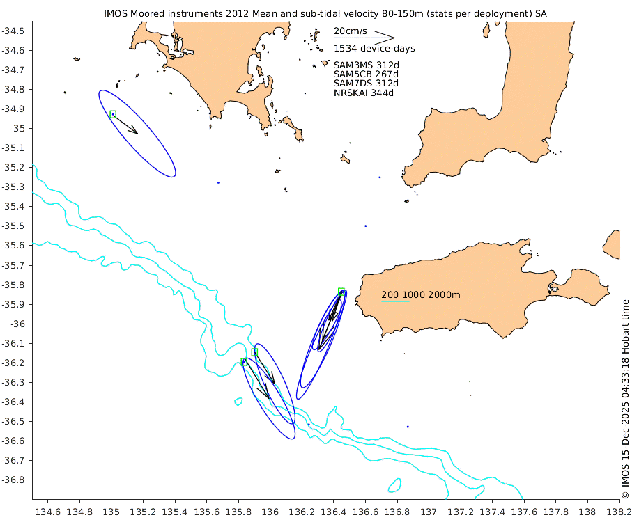 These maps show some basic analyses of the velocity data: mean (all-time in black and seasonal in colour) and sub-tidal variance for several layers and time-windows, and tidal harmonics for the depth-average velocity using the whole record. Click through to see more detailed plots of the selected dataset or to download those data from the AODN thredds server.