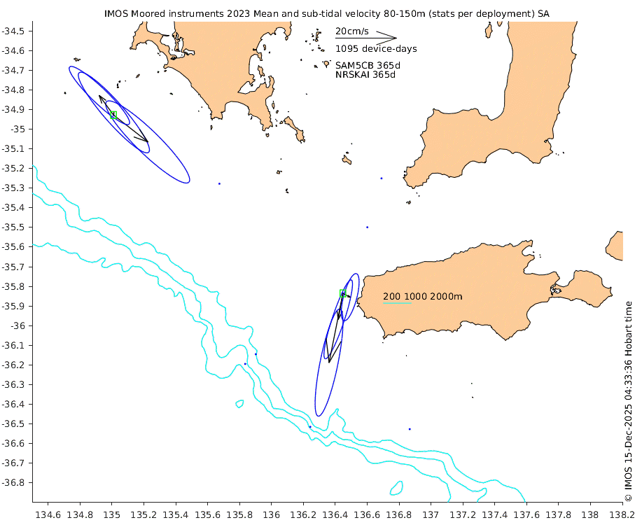 These maps show some basic analyses of the velocity data: mean (all-time in black and seasonal in colour) and sub-tidal variance for several layers and time-windows, and tidal harmonics for the depth-average velocity using the whole record. Click through to see more detailed plots of the selected dataset or to download those data from the AODN thredds server.