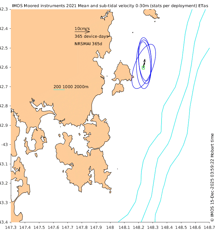 These maps show some basic analyses of the velocity data: mean (all-time in black and seasonal in colour) and sub-tidal variance for several layers and time-windows, and tidal harmonics for the depth-average velocity using the whole record. Click through to see more detailed plots of the selected dataset or to download those data from the AODN thredds server.