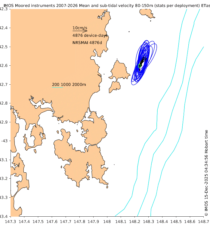 These maps show some basic analyses of the velocity data: mean (all-time in black and seasonal in colour) and sub-tidal variance for several layers and time-windows, and tidal harmonics for the depth-average velocity using the whole record. Click through to see more detailed plots of the selected dataset or to download those data from the AODN thredds server.