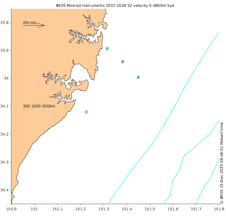 These maps show some basic analyses of the velocity data: mean (all-time in black and seasonal in colour) and sub-tidal variance for several layers and time-windows, and tidal harmonics for the depth-average velocity using the whole record. Click through to see more detailed plots of the selected dataset or to download those data from the AODN thredds server.