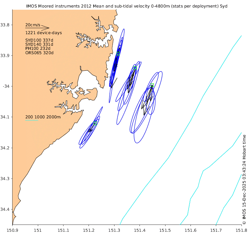 These maps show some basic analyses of the velocity data: mean (all-time in black and seasonal in colour) and sub-tidal variance for several layers and time-windows, and tidal harmonics for the depth-average velocity using the whole record. Click through to see more detailed plots of the selected dataset or to download those data from the AODN thredds server.