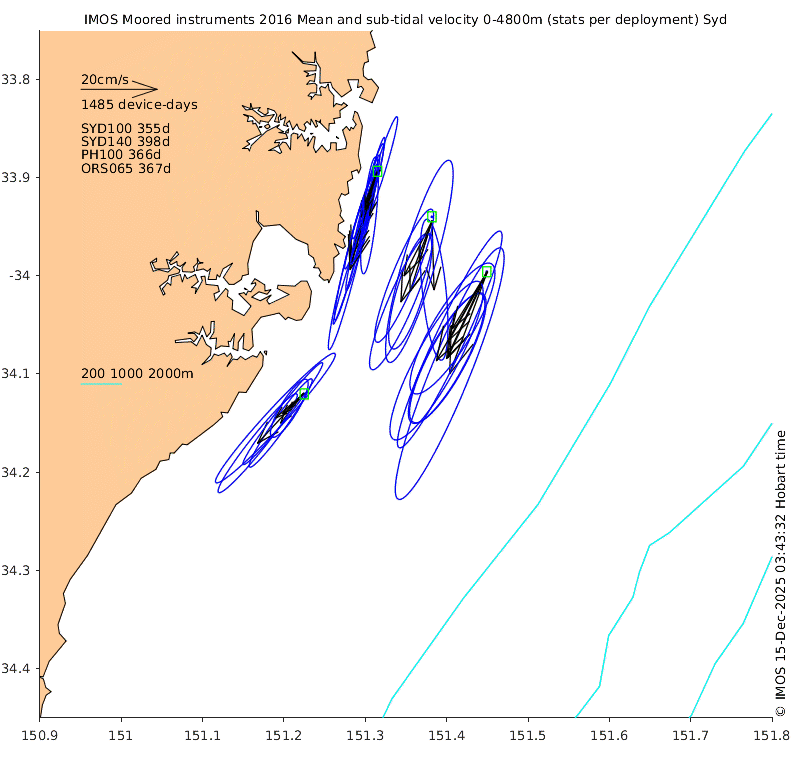 These maps show some basic analyses of the velocity data: mean (all-time in black and seasonal in colour) and sub-tidal variance for several layers and time-windows, and tidal harmonics for the depth-average velocity using the whole record. Click through to see more detailed plots of the selected dataset or to download those data from the AODN thredds server.