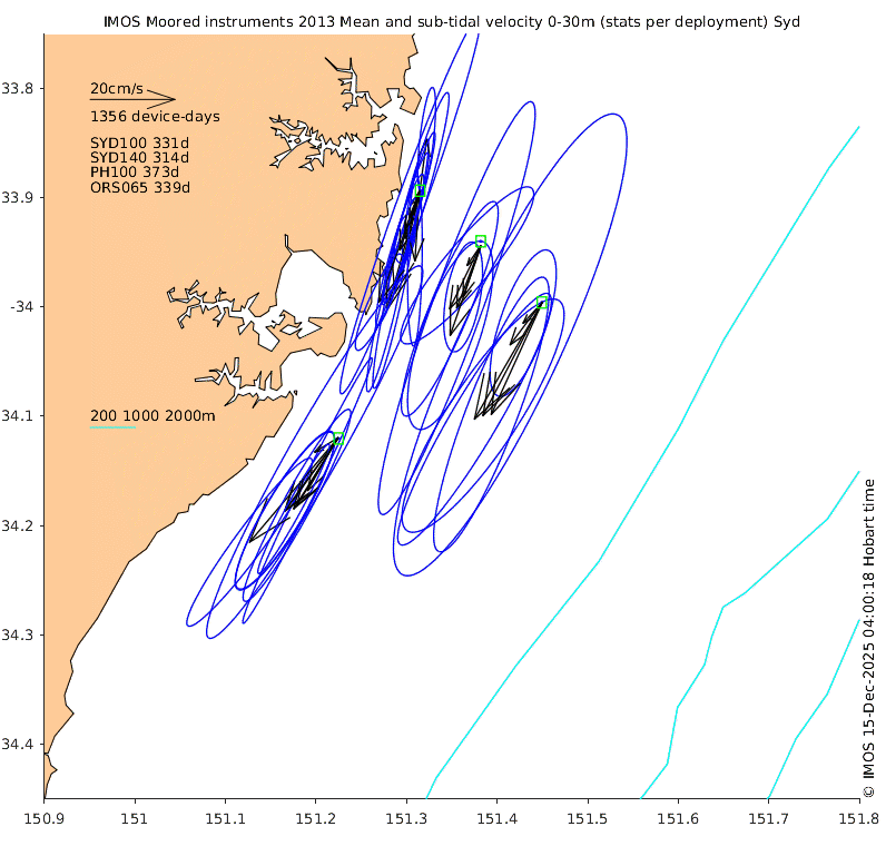 These maps show some basic analyses of the velocity data: mean (all-time in black and seasonal in colour) and sub-tidal variance for several layers and time-windows, and tidal harmonics for the depth-average velocity using the whole record. Click through to see more detailed plots of the selected dataset or to download those data from the AODN thredds server.
