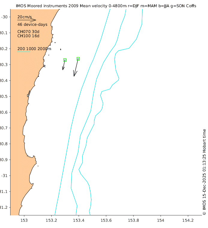 These maps show some basic analyses of the velocity data: mean (all-time in black and seasonal in colour) and sub-tidal variance for several layers and time-windows, and tidal harmonics for the depth-average velocity using the whole record. Click through to see more detailed plots of the selected dataset or to download those data from the AODN thredds server.