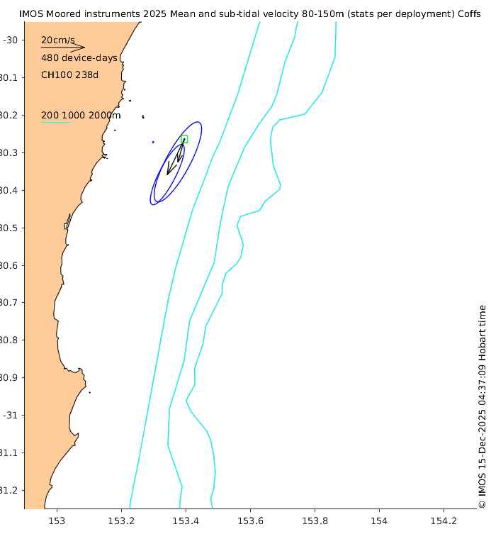 These maps show some basic analyses of the velocity data: mean (all-time in black and seasonal in colour) and sub-tidal variance for several layers and time-windows, and tidal harmonics for the depth-average velocity using the whole record. Click through to see more detailed plots of the selected dataset or to download those data from the AODN thredds server.