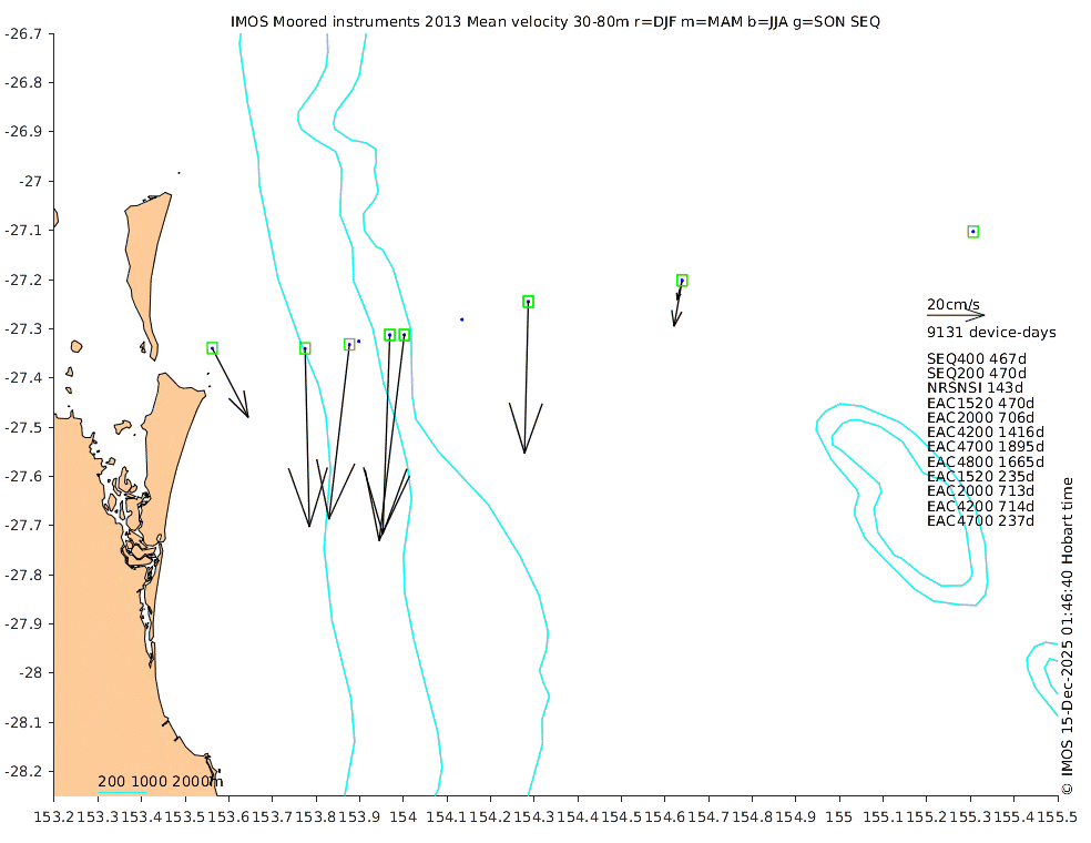 These maps show some basic analyses of the velocity data: mean (all-time in black and seasonal in colour) and sub-tidal variance for several layers and time-windows, and tidal harmonics for the depth-average velocity using the whole record. Click through to see more detailed plots of the selected dataset or to download those data from the AODN thredds server.