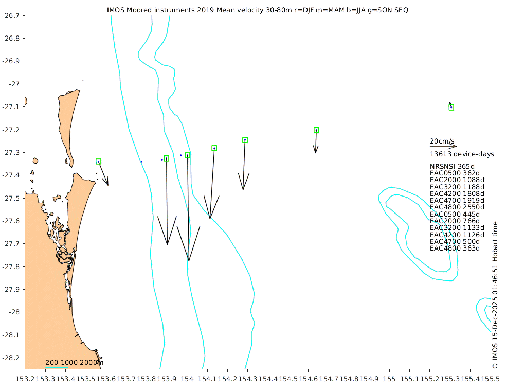 These maps show some basic analyses of the velocity data: mean (all-time in black and seasonal in colour) and sub-tidal variance for several layers and time-windows, and tidal harmonics for the depth-average velocity using the whole record. Click through to see more detailed plots of the selected dataset or to download those data from the AODN thredds server.