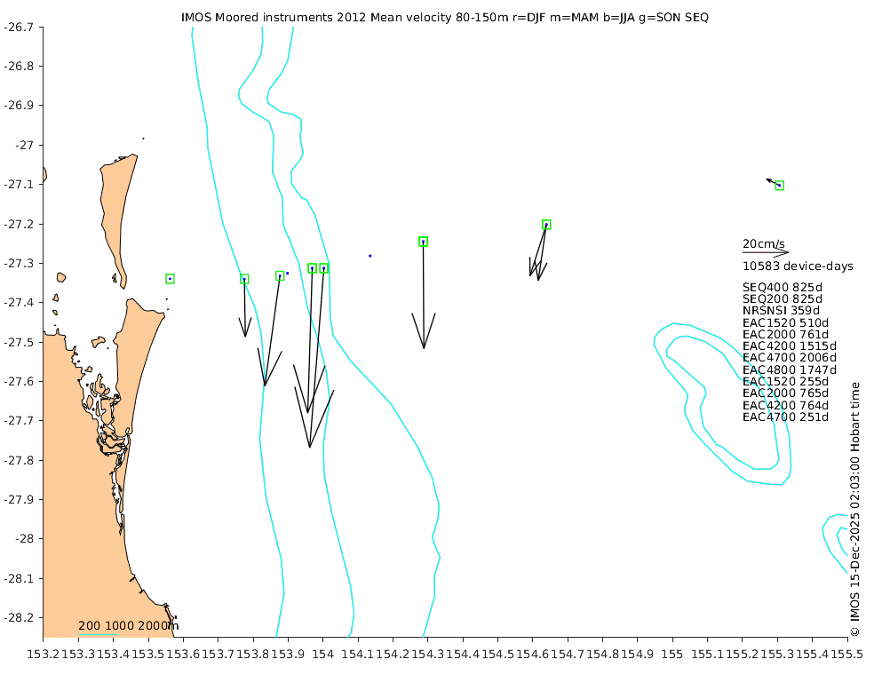 These maps show some basic analyses of the velocity data: mean (all-time in black and seasonal in colour) and sub-tidal variance for several layers and time-windows, and tidal harmonics for the depth-average velocity using the whole record. Click through to see more detailed plots of the selected dataset or to download those data from the AODN thredds server.