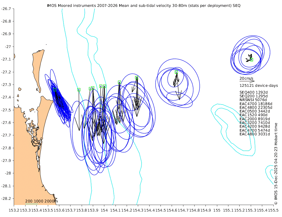 These maps show some basic analyses of the velocity data: mean (all-time in black and seasonal in colour) and sub-tidal variance for several layers and time-windows, and tidal harmonics for the depth-average velocity using the whole record. Click through to see more detailed plots of the selected dataset or to download those data from the AODN thredds server.