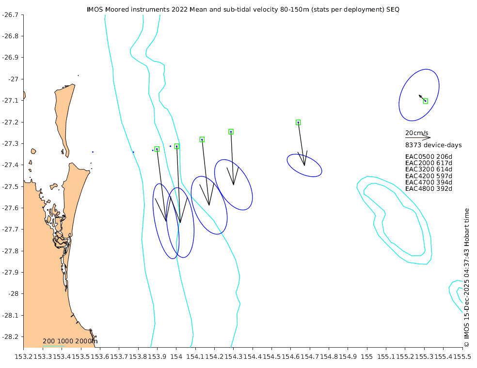 These maps show some basic analyses of the velocity data: mean (all-time in black and seasonal in colour) and sub-tidal variance for several layers and time-windows, and tidal harmonics for the depth-average velocity using the whole record. Click through to see more detailed plots of the selected dataset or to download those data from the AODN thredds server.