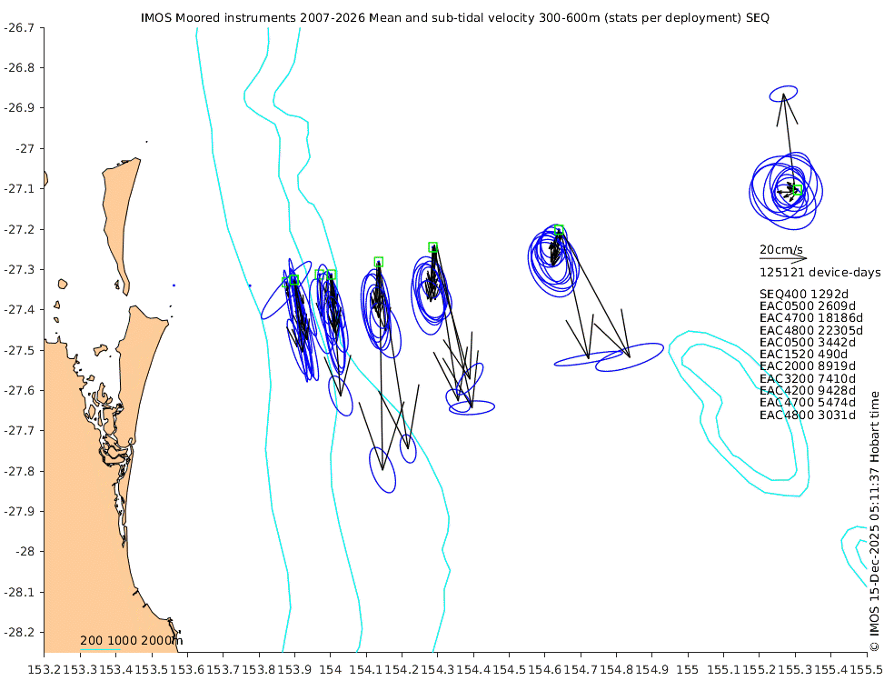 These maps show some basic analyses of the velocity data: mean (all-time in black and seasonal in colour) and sub-tidal variance for several layers and time-windows, and tidal harmonics for the depth-average velocity using the whole record. Click through to see more detailed plots of the selected dataset or to download those data from the AODN thredds server.
