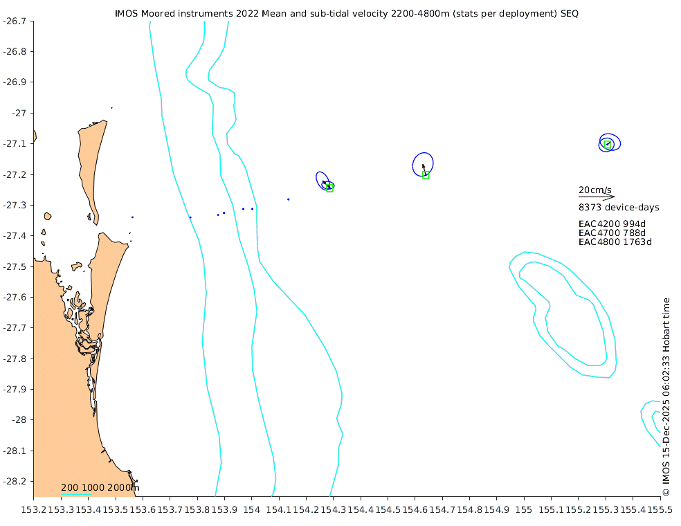 These maps show some basic analyses of the velocity data: mean (all-time in black and seasonal in colour) and sub-tidal variance for several layers and time-windows, and tidal harmonics for the depth-average velocity using the whole record. Click through to see more detailed plots of the selected dataset or to download those data from the AODN thredds server.