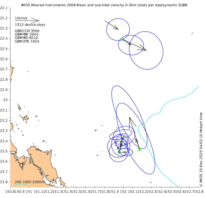 These maps show some basic analyses of the velocity data: mean (all-time in black and seasonal in colour) and sub-tidal variance for several layers and time-windows, and tidal harmonics for the depth-average velocity using the whole record. Click through to see more detailed plots of the selected dataset or to download those data from the AODN thredds server.