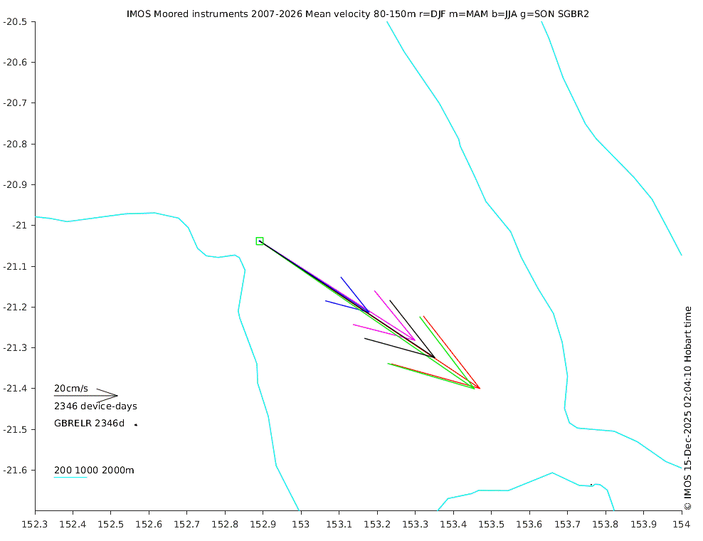 These maps show some basic analyses of the velocity data: mean (all-time in black and seasonal in colour) and sub-tidal variance for several layers and time-windows, and tidal harmonics for the depth-average velocity using the whole record. Click through to see more detailed plots of the selected dataset or to download those data from the AODN thredds server.