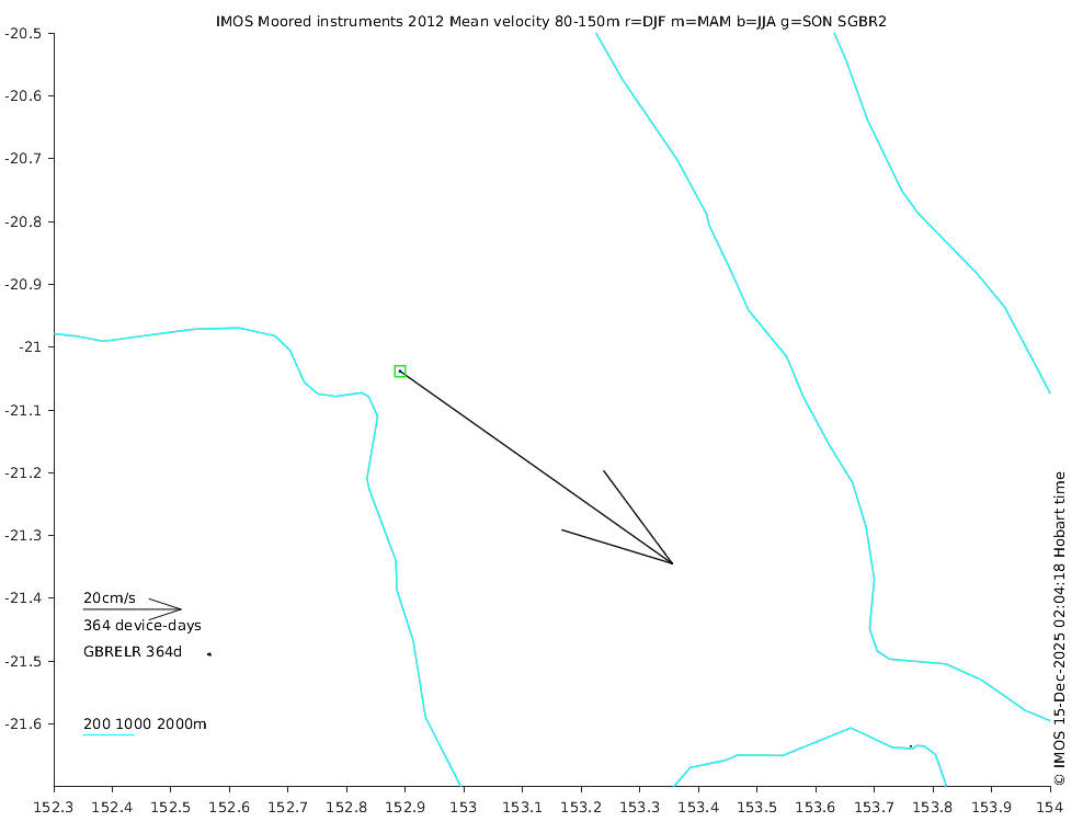 These maps show some basic analyses of the velocity data: mean (all-time in black and seasonal in colour) and sub-tidal variance for several layers and time-windows, and tidal harmonics for the depth-average velocity using the whole record. Click through to see more detailed plots of the selected dataset or to download those data from the AODN thredds server.