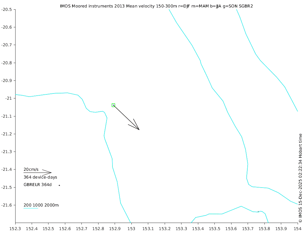 These maps show some basic analyses of the velocity data: mean (all-time in black and seasonal in colour) and sub-tidal variance for several layers and time-windows, and tidal harmonics for the depth-average velocity using the whole record. Click through to see more detailed plots of the selected dataset or to download those data from the AODN thredds server.