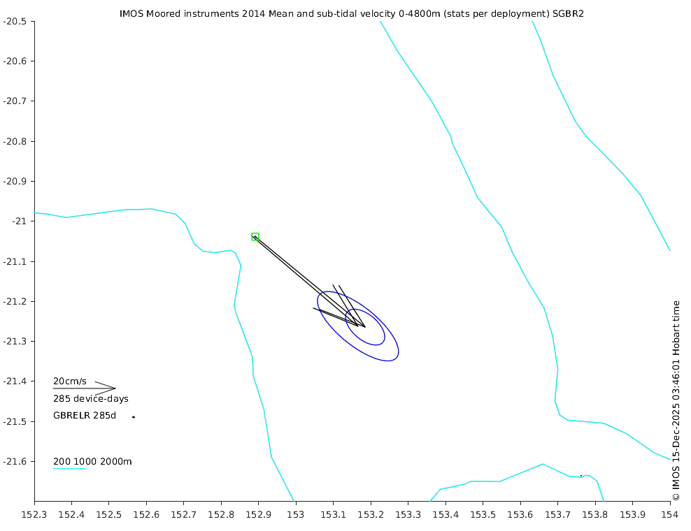 These maps show some basic analyses of the velocity data: mean (all-time in black and seasonal in colour) and sub-tidal variance for several layers and time-windows, and tidal harmonics for the depth-average velocity using the whole record. Click through to see more detailed plots of the selected dataset or to download those data from the AODN thredds server.