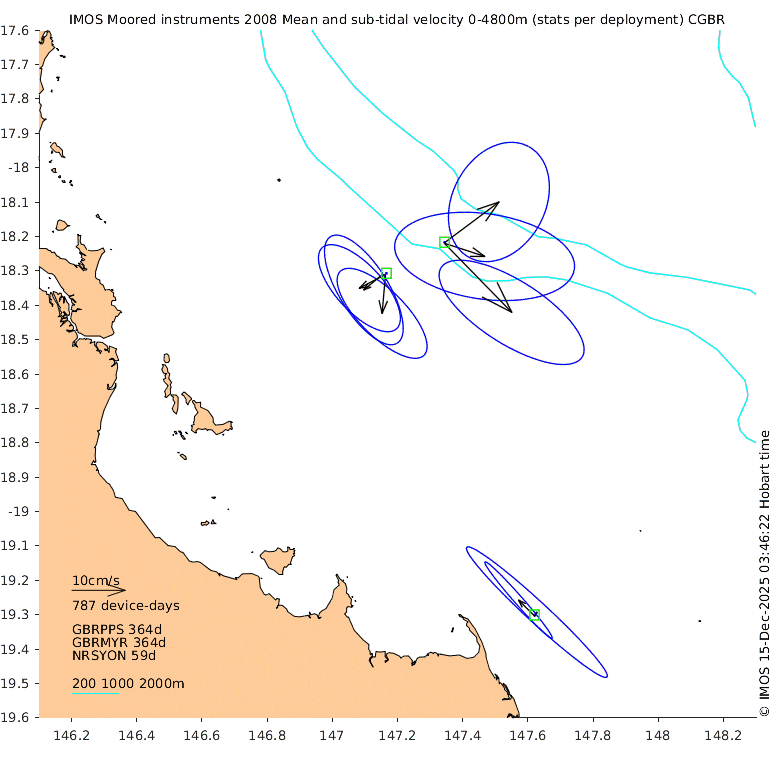 These maps show some basic analyses of the velocity data: mean (all-time in black and seasonal in colour) and sub-tidal variance for several layers and time-windows, and tidal harmonics for the depth-average velocity using the whole record. Click through to see more detailed plots of the selected dataset or to download those data from the AODN thredds server.