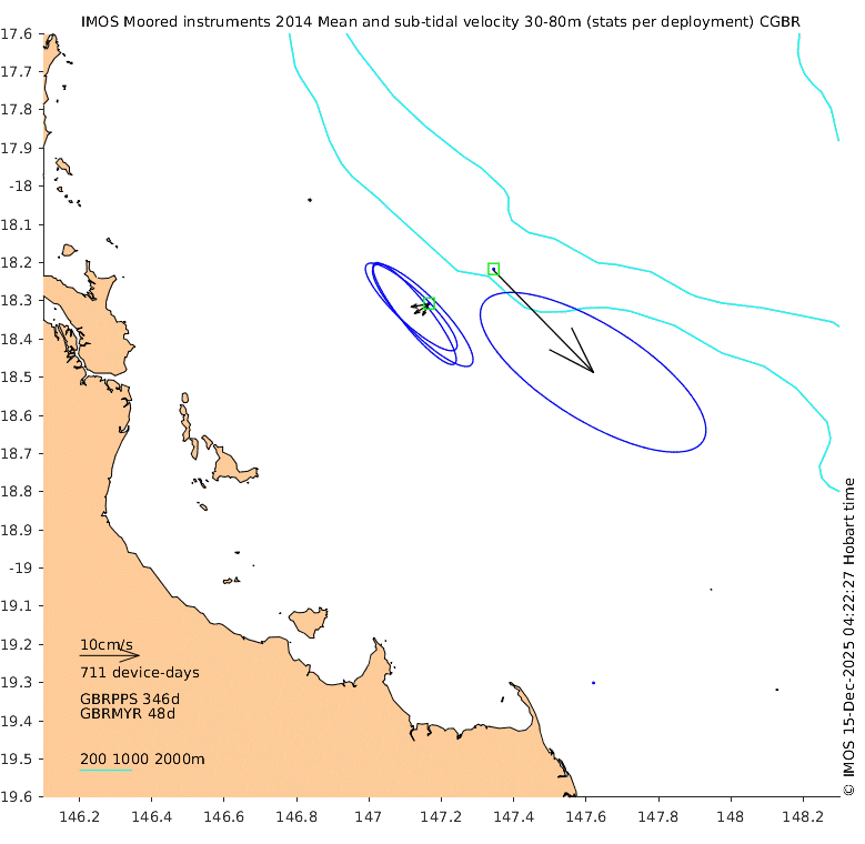 These maps show some basic analyses of the velocity data: mean (all-time in black and seasonal in colour) and sub-tidal variance for several layers and time-windows, and tidal harmonics for the depth-average velocity using the whole record. Click through to see more detailed plots of the selected dataset or to download those data from the AODN thredds server.