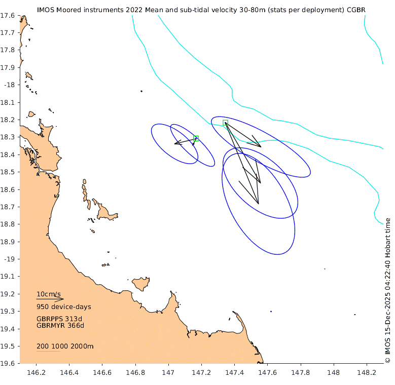 These maps show some basic analyses of the velocity data: mean (all-time in black and seasonal in colour) and sub-tidal variance for several layers and time-windows, and tidal harmonics for the depth-average velocity using the whole record. Click through to see more detailed plots of the selected dataset or to download those data from the AODN thredds server.