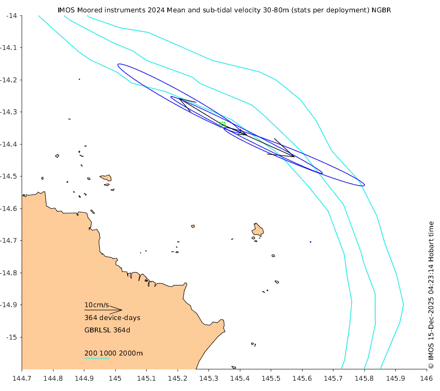 These maps show some basic analyses of the velocity data: mean (all-time in black and seasonal in colour) and sub-tidal variance for several layers and time-windows, and tidal harmonics for the depth-average velocity using the whole record. Click through to see more detailed plots of the selected dataset or to download those data from the AODN thredds server.