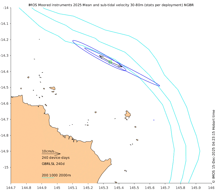 These maps show some basic analyses of the velocity data: mean (all-time in black and seasonal in colour) and sub-tidal variance for several layers and time-windows, and tidal harmonics for the depth-average velocity using the whole record. Click through to see more detailed plots of the selected dataset or to download those data from the AODN thredds server.