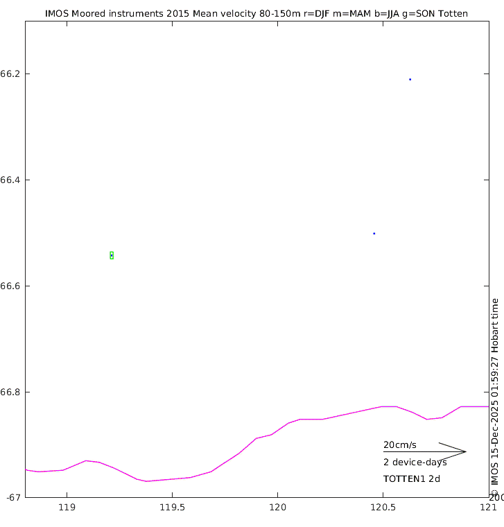 These maps show some basic analyses of the velocity data: mean (all-time in black and seasonal in colour) and sub-tidal variance for several layers and time-windows, and tidal harmonics for the depth-average velocity using the whole record. Click through to see more detailed plots of the selected dataset or to download those data from the AODN thredds server.