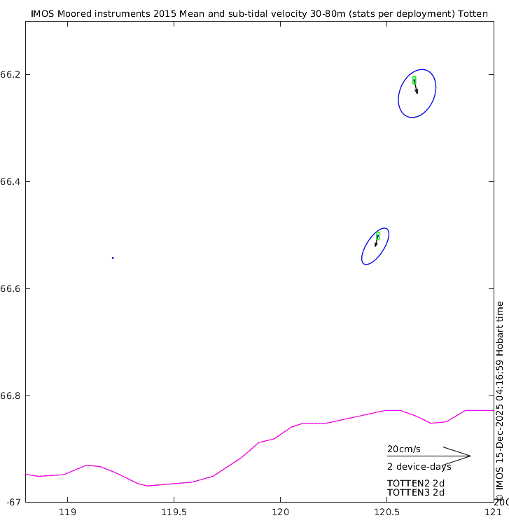 These maps show some basic analyses of the velocity data: mean (all-time in black and seasonal in colour) and sub-tidal variance for several layers and time-windows, and tidal harmonics for the depth-average velocity using the whole record. Click through to see more detailed plots of the selected dataset or to download those data from the AODN thredds server.