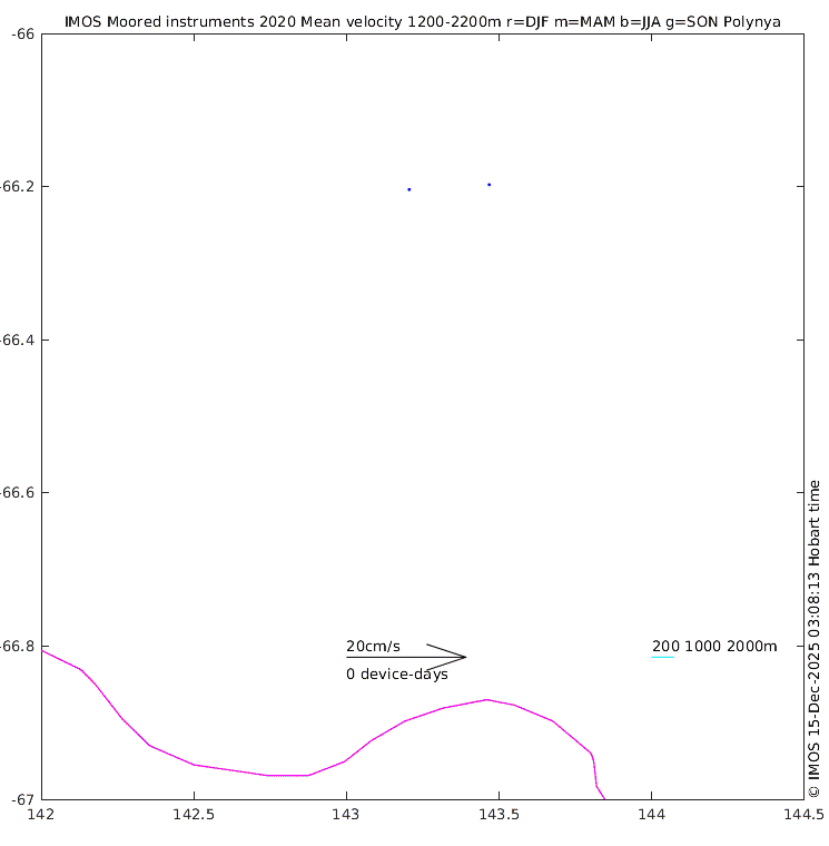 These maps show some basic analyses of the velocity data: mean (all-time in black and seasonal in colour) and sub-tidal variance for several layers and time-windows, and tidal harmonics for the depth-average velocity using the whole record. Click through to see more detailed plots of the selected dataset or to download those data from the AODN thredds server.