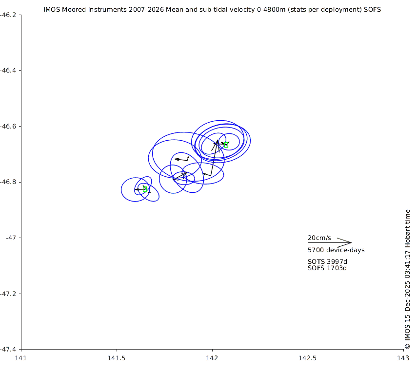 These maps show some basic analyses of the velocity data: mean (all-time in black and seasonal in colour) and sub-tidal variance for several layers and time-windows, and tidal harmonics for the depth-average velocity using the whole record. Click through to see more detailed plots of the selected dataset or to download those data from the AODN thredds server.