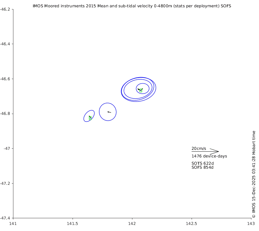These maps show some basic analyses of the velocity data: mean (all-time in black and seasonal in colour) and sub-tidal variance for several layers and time-windows, and tidal harmonics for the depth-average velocity using the whole record. Click through to see more detailed plots of the selected dataset or to download those data from the AODN thredds server.
