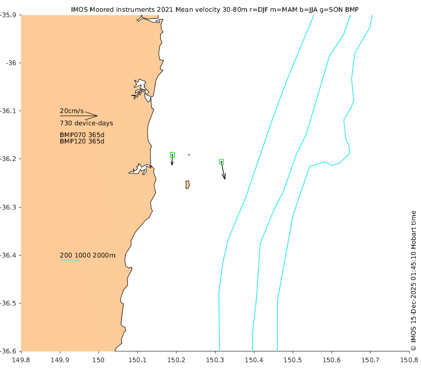 These maps show some basic analyses of the velocity data: mean (all-time in black and seasonal in colour) and sub-tidal variance for several layers and time-windows, and tidal harmonics for the depth-average velocity using the whole record. Click through to see more detailed plots of the selected dataset or to download those data from the AODN thredds server.