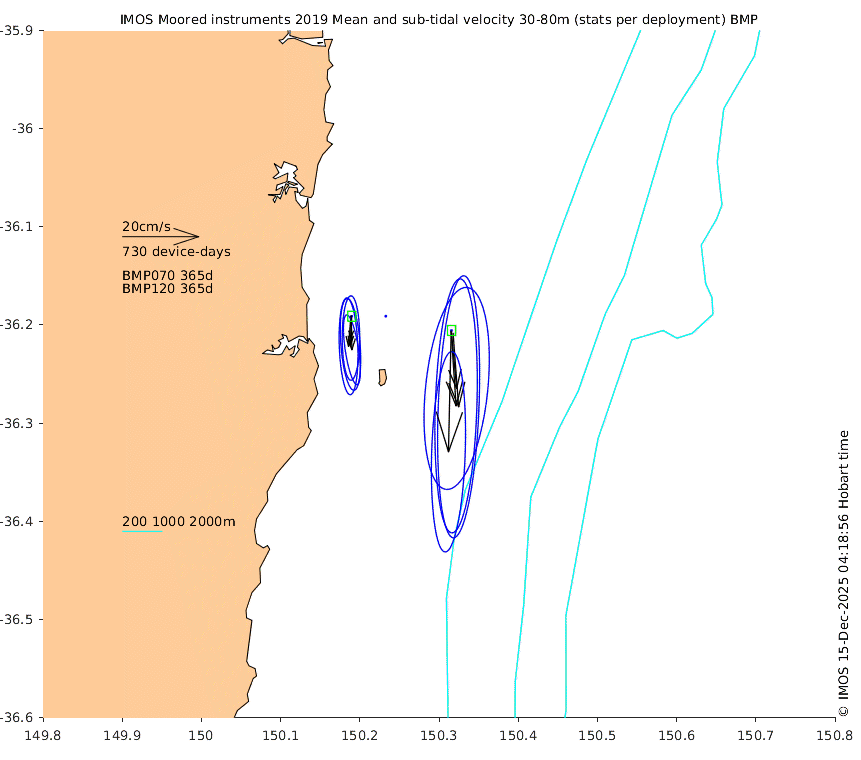 These maps show some basic analyses of the velocity data: mean (all-time in black and seasonal in colour) and sub-tidal variance for several layers and time-windows, and tidal harmonics for the depth-average velocity using the whole record. Click through to see more detailed plots of the selected dataset or to download those data from the AODN thredds server.