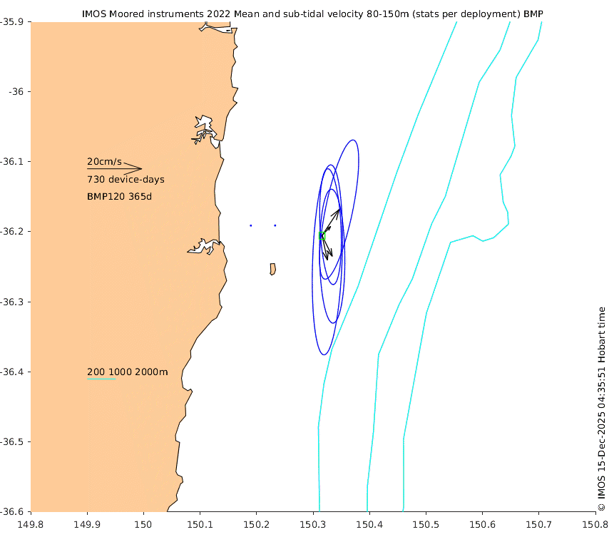 These maps show some basic analyses of the velocity data: mean (all-time in black and seasonal in colour) and sub-tidal variance for several layers and time-windows, and tidal harmonics for the depth-average velocity using the whole record. Click through to see more detailed plots of the selected dataset or to download those data from the AODN thredds server.