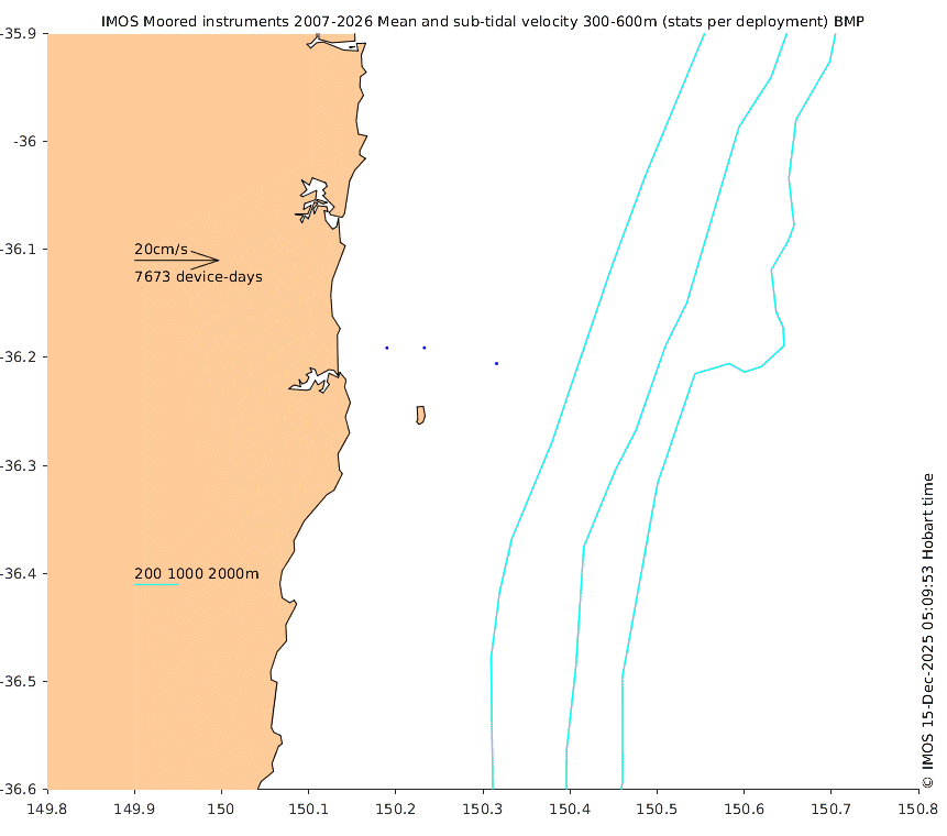 These maps show some basic analyses of the velocity data: mean (all-time in black and seasonal in colour) and sub-tidal variance for several layers and time-windows, and tidal harmonics for the depth-average velocity using the whole record. Click through to see more detailed plots of the selected dataset or to download those data from the AODN thredds server.